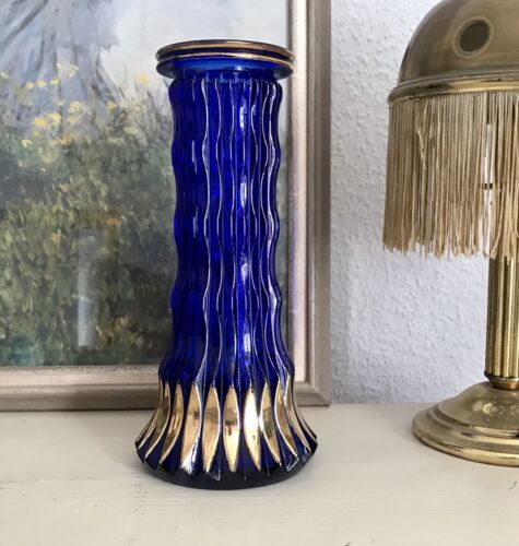 Vintage 70er blau gold Pressglas Vase Glasvase Glas Walther Kultig