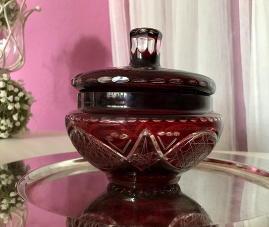 Vintage EDEL Glasdose Deckeldose Bonboniere Kristallglas Schliff Rubin Rot
