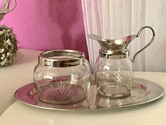 Antik Jugendstil 3 Teile Milch& Zucker Tablett Metallmontur & Glas geschliffen