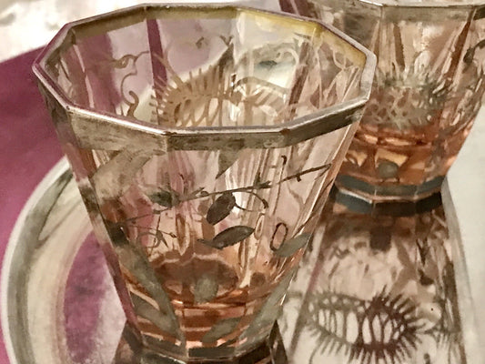 Antik ? Art Déco? 4 Likörgläser Schnapsgläser kantig Silberbeschichtung Böhmen?