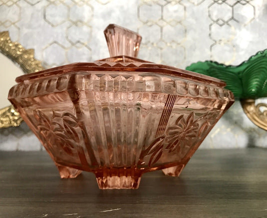 Antik Art Déco Dose Deckeldose Zierdose Pressglas Rosalin rosa Glas
