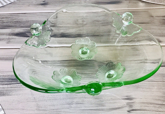 Antik Art Déco kanarien grün Pressglas Schale Glas dreipassig markant Blumen