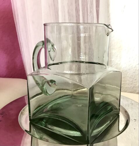 Vintage Vierkant Krug Glaskrug Glas Kanne Karaffe grünlich mundgeblasen