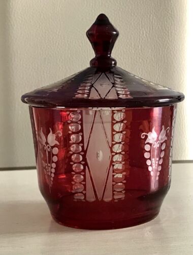 Antik Art Déco EDEL Bonboniere Glas Dose Deckeldose Rubin rot Böhmisch Schliff