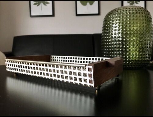 Alt Vintage 60er Tablett Metall perforiert Holz Teak weiß&braun