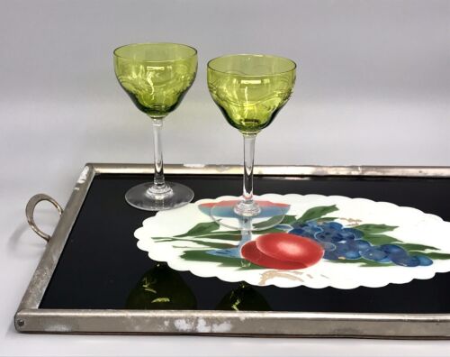Antik Art Déco groß Tablett Glas Holz Chrom schwarz grün rot