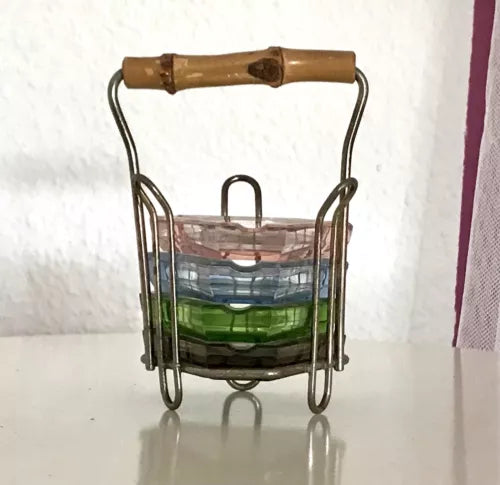 Vintage 60er Set Glas 4 bunt Aschenbecher Ascher im Ständer Messing? Bambusgriff