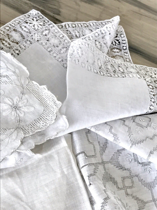 Antik 4x Taschentuch Taschentücher Stickerei weiß Batist Spitze elegant bestickt