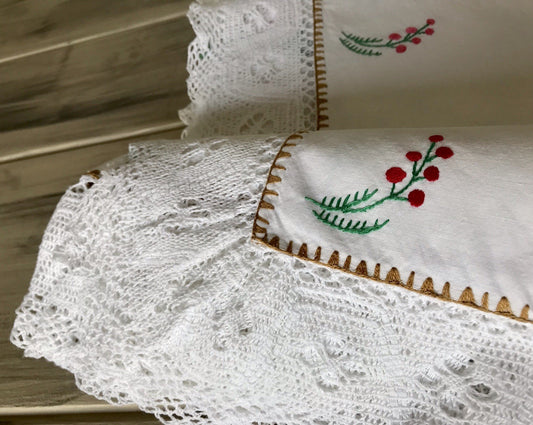Antik Alt Tischdecke weiß bunt Zweige Stickerei Klöppelspitze