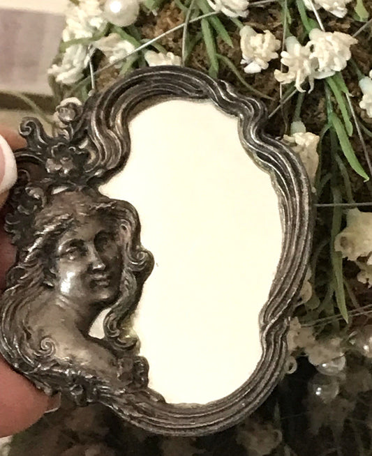 Antik kleiner Taschenspiegel Spiegel versilbert Jugendstil Frau-Büste