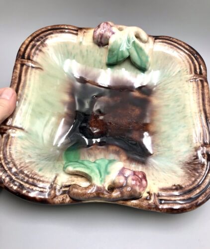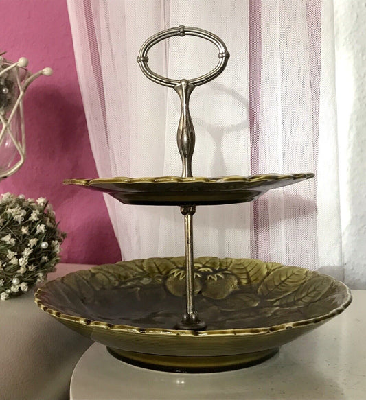 Antik Sarreguemines France Majolika Keramik Etagere Schale Obstmuster grün oliv