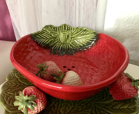 Vintage Keramik Erdbeer Schale mit Teller Untersetzer und Ablauf 2 Teile Italy