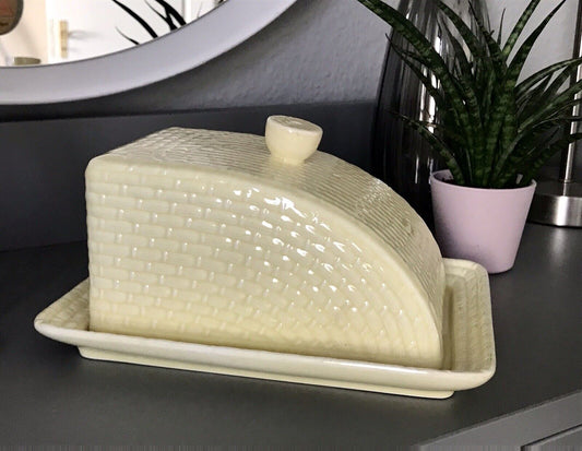 Antik Max Rösler Keramik Art Déco Käseglocke Butterglocke gelb Korbrelief