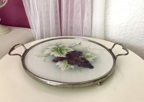 Antik Jugendstil Art Déco Tortenplatte Metallmontur Keramik Weinranken gemarkt
