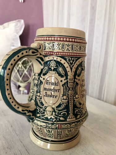 Antik Krug Bierseidel Keramik Trinkt mancher andre aus Gold seinen Wein Schön!