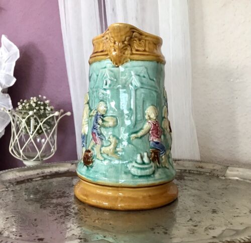 Antik Keramik Majolika Schankkrug Kanne Krug 1900-20 Relief feiernde Gesellschaf