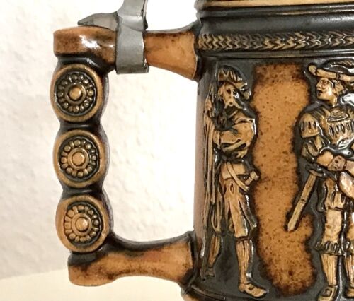 Krug Bierkrug Keramik Gerz Bierhumpen historische Musikanten Motive Zinnmontur