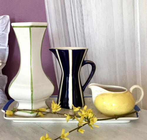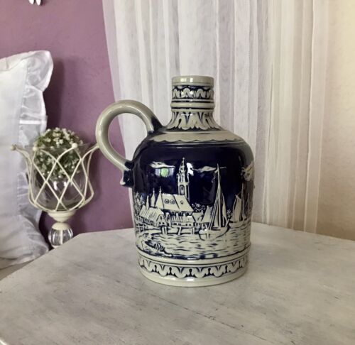 Vintage 50er Keramik Kanne Krug Dekor kobaltblau weiß Goldrand wunderschön!
