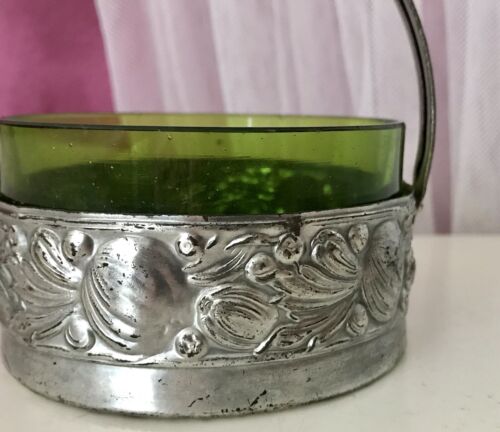 Antik Jugendstil Metallmontur Schale Zuckerschale Original grüner Glaseinsatz