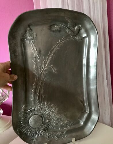 Antik Große Zinn Schale Jugendstil ~1900 Motiv: Vogel auf Distelzweig So Schön
