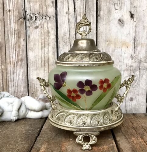 Antik Jugendstil Bonboniere Konfektdose Dose versilbert Glaseinsatz grün bemalt