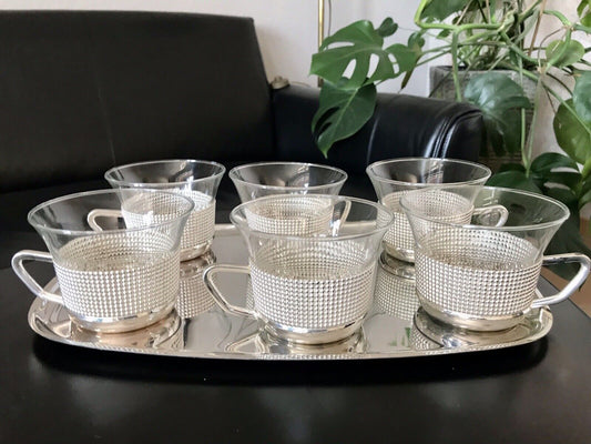 Vintage 60er 6x Teeglashalter Teeservice Glaseinsätzen & Tablett versilbert 60er