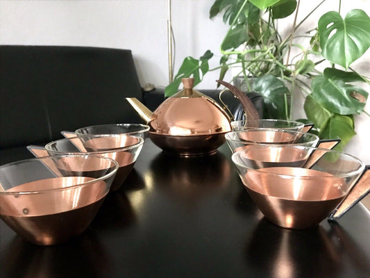 Vintage 60er 6x Teeglashalter mit Glaseinsätzen & Kanne Kupfer Teak