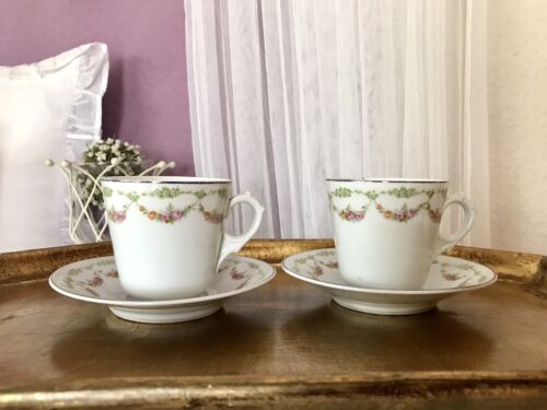 Jugendstil Porzellan 2x Kaffee-Gedeck Tassen rosa Blumengirlanden