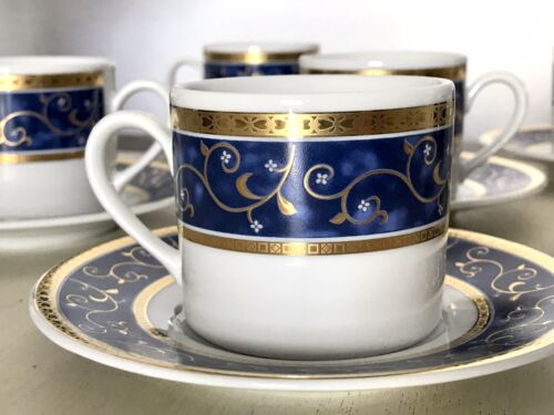 Porzellan Kaffeeservice 6 Personen Blau Golddekor Mokka + Tablett Langenthal