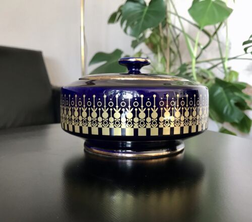 Vintage 70er Porzellan Dose Deckeldose Schale Bonboniere Kobalt Golddekor