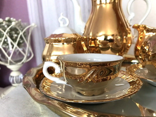 Barocke Optik Porzellan Kaffeeservice vergoldet Tête-à-Tête mit Spiegel-Tablett