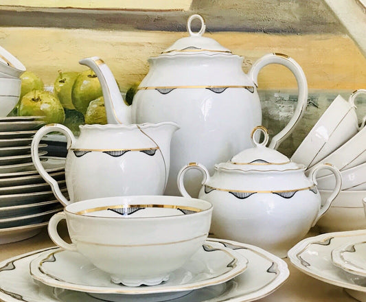 Antik Art Déco Porzellan Kaffeeservice 10 Pers. ivory schwarz gold