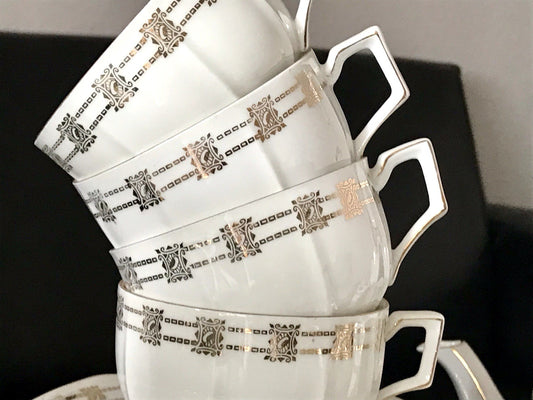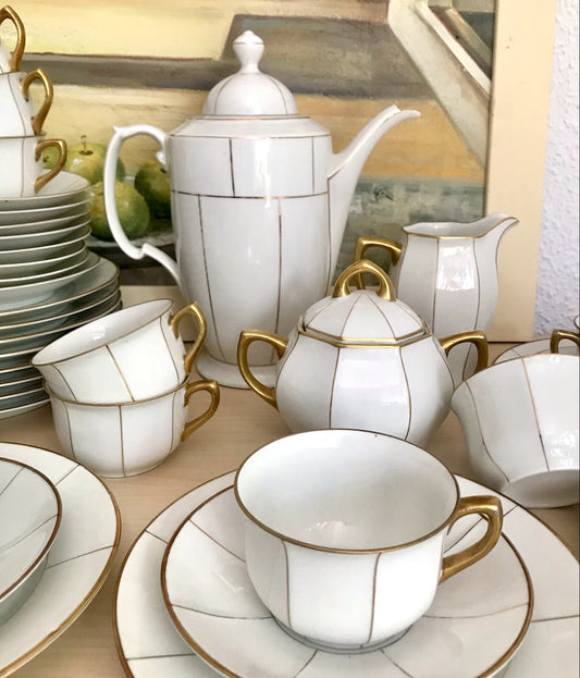 Antik Art Déco Porzellan 10+ Personen Kaffeeservice EDEL weiß Golddekor kantig