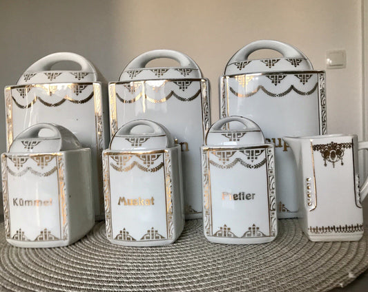 Antik Jugendstil 6 Porzellan Vorratsdosen Gefäße &1 Kännchen Graupen Sago Nudeln