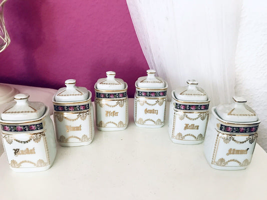 Antik 6x Porzellan Dose Vorratsdosen Gewürze Rosen Golddekor Jugendstil