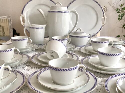 Antik Art Déco Tirschenreuth Porzellan Kaffeeservice 9 Pers. weiß lila Goldrand