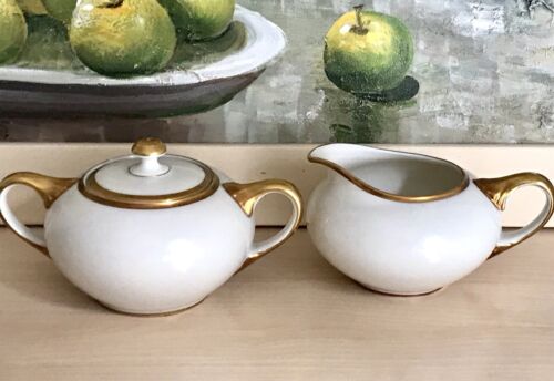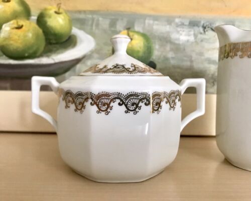 Antik Art Déco Porzellan Sahnegießer & Zuckerdose Golddekor Kantiges Design
