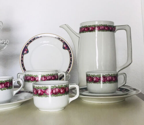Antik Art Déco Porzellan Kaffeeservice Rosenbordüre Rosen grüner Rand