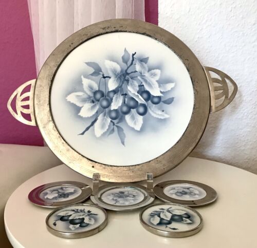 Antik Jugendstil Tortenplatte & 5 Untersetzer Metallmontur Porzellan gemarkt