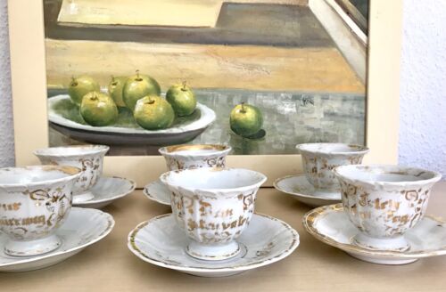 Antik Porzellan 6 Pers. Kaffeeservice Tassen Weiß Golddekor Andenken Schriftzug