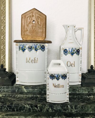 Antik Jugendstil Porzellan Vorratsgefäß Mehlmeste Ölkaraffe Golddekor Nelken