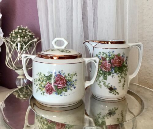 Antik Jugendstil Porzellan Sahnegießer & Zuckerdose Sezession Rosenmuster