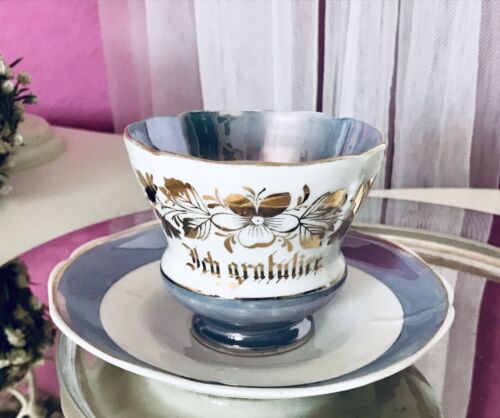Antik Porzellan Andenken Becher blau weiß gold Gedeck Tasse „ Ich gratulire“