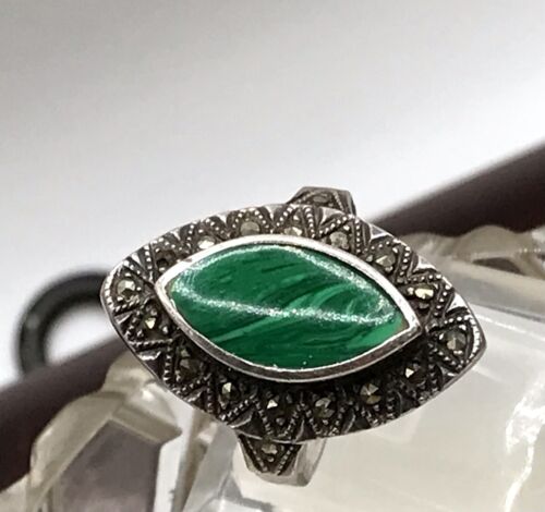 Antik Edel Art Déco Malachit Markasite DAMEN RING Silber SUPER Gr.51 16,3