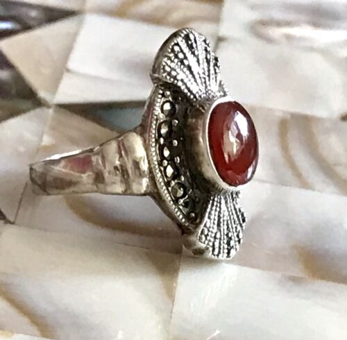 Antik Edel Art Déco Karneol Markasite DAMEN RING Silber SUPER Gr.56 17,5