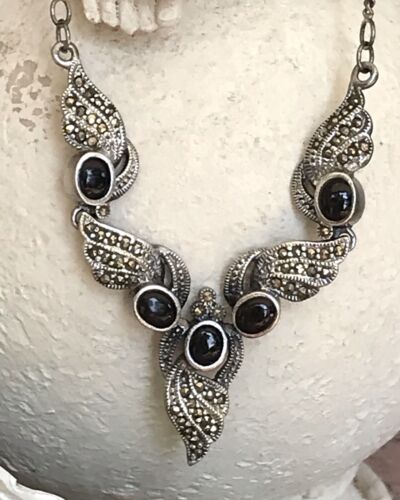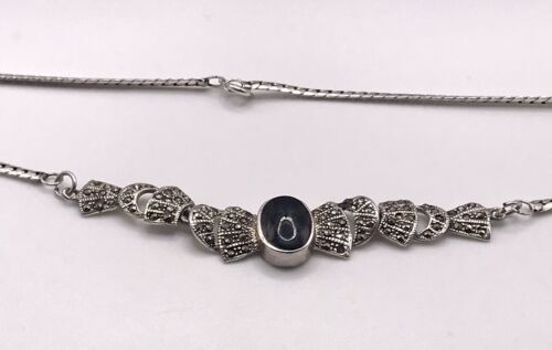 Antik Edel Art Déco 925 Silber Collier Halskette mit Onyx & Markasite