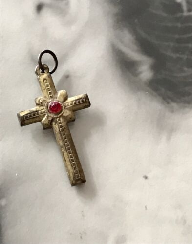 Antik Kettenanhänger Anhänger Farbe gold Amerikan Doublè? Kreuz roter Stein
