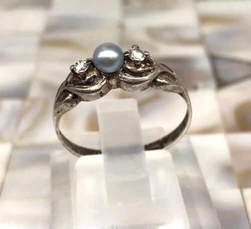 Antik Trilogie Damen Ring Perle 2 farblose Steine Silber Gr.60 19,1