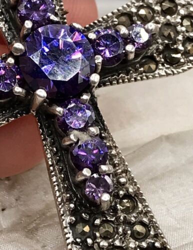 Edel Art Déco Stil 925 Silber Halskette Kreuz Anhänger Amethyste? lila Steine