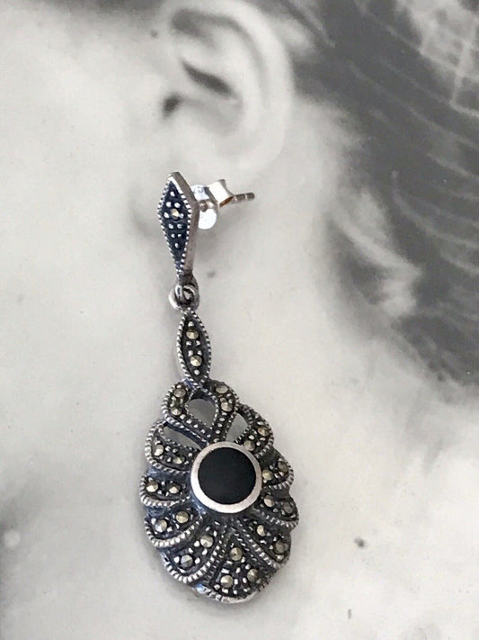 Antik Art Déco Wunderschön Ohrhänger Ohrringe DAMEN Silber 925 Onyx Markasite